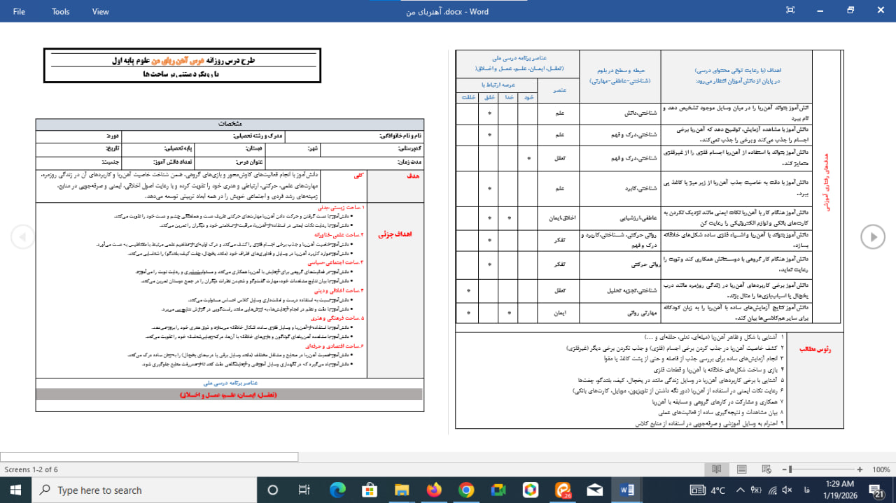این طرح درس تمام ساحتی «آهنربای من» برای علوم اول دبستان با دقت بالا و بر اساس ساحتهای ششگانه تعلیم و تربیت توسط دکتر پیمان عرفانی، داور رسمی جشنوارههای آموزشی، تدوین شده است. محتوای این فایل دقیقاً مطابق استانداردهای ارزیابی جشنوارههاست و بارها بهعنوان طرح مقامآور در مسابقات استانی و کشوری پذیرفته شده است. با تهیه این محصول، شما یک طرح درس کامل، علمی و تضمینی دریافت میکنید که نهتنها آرامش خاطر در بازدید و ارزیابیها به شما میدهد، بلکه فرصت درخشش و کسب رتبه را نیز فراهم میکند. اگر بهدنبال یک طرح بینقص و تاییدشده هستید، همین حالا این فایل ارزشمند را دانلود کنید و یک گام از سایرین جلوتر باشید.